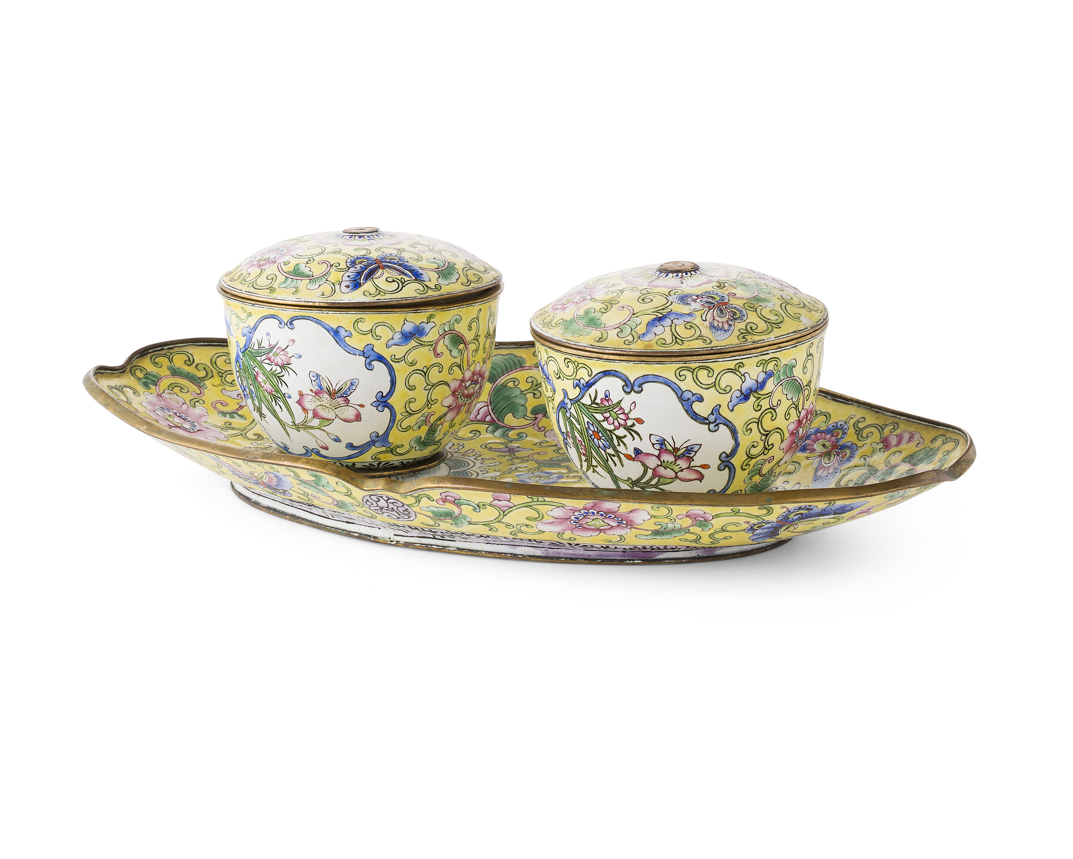 comprising two bowls and covers and a lobed tray, the bowls of circular form decorated with two shaped reserves depicting plum blossoms on one side and a peony and butterfly on the other, the covers with a central peony amongst further flowerheads and butterflies, the same decoration repeated on the sides of the bowl and on the tray, all on pale yellow ground (3)