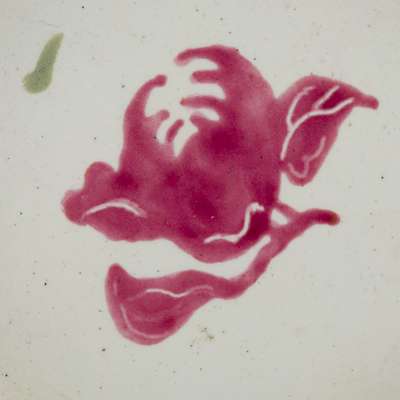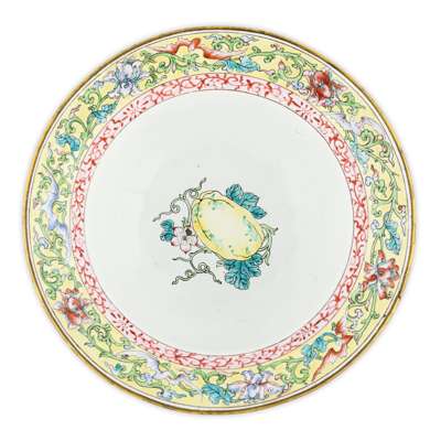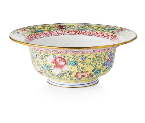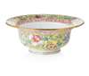 the exterior and the interior of the flaring mouth rim luxuriantly decorated on a yellow ground with floral blooms on leafy scrolls, the centre of the interior and of the bottom decorated with a pomegranate fruit (2)