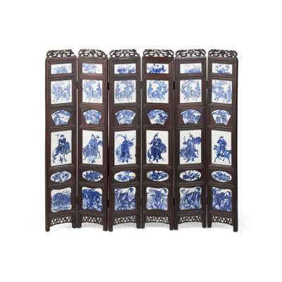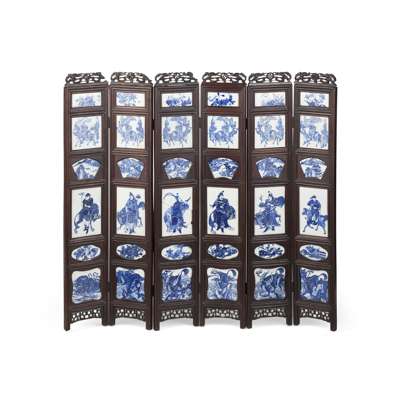 the openwork carved crestings above six folds, each set with blue and white porcelain panels, decorated with immortals, exotic birds, mountainous landscapes, auspicious items and mythical beasts