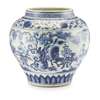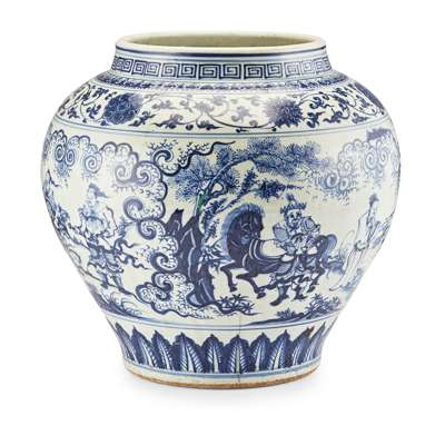 the heavily potted globular body decorated in Yuan-style with five horizontal bands, the main band painted with two scenes from Chinese legends, one depicting Jiang Ziya angling, the other Liu Bei's visit to the thatched cottage, above a band of plantain leaves and below a continuous meander of six large-headed peony flowers, a ruyi-head band and a key-fret band