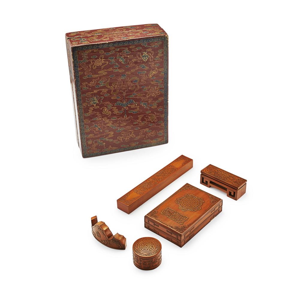 including an inkstone box, a seal paste box, a scroll weight, a brush rest, a stand, carved with dragons and the auspicious shou character, contained in a red lacquered box decorated with Bajixiang (the Eight Treasures)