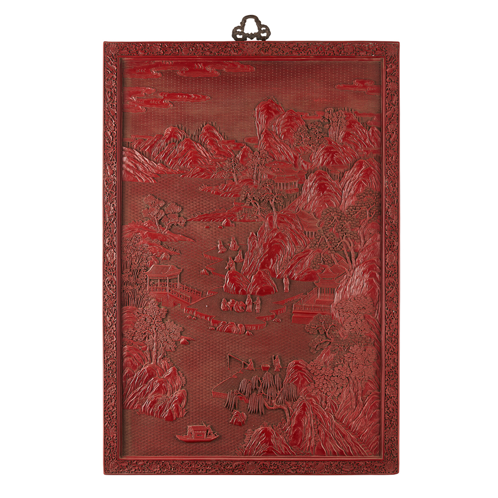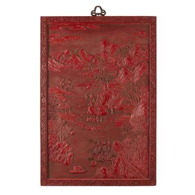 LARGE CARVED CINNABAR LACQUER PANEL