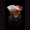 carved with double vessels in the shape of lingzhi heads borne on a gnarled branch issuing further smaller lingzhi heads, the stone of a milky white tone with red and brown inclusions cleverly worked into the carving, with wood stand