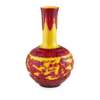 the vase of globular form with thick walls, carved through the red outer layer to the golden yellow body with key-fret border to the rim and with stiff leaf lappets to the neck, the body decorated with five ferocious four-clawed dragons chasing the flaming pearls above waves