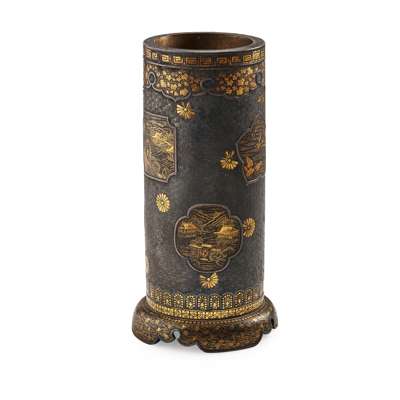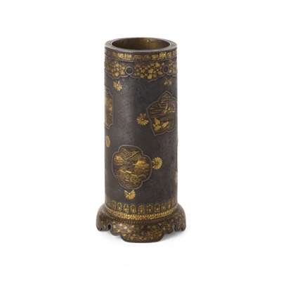 of cylindrical form, decorated in typical Komai manner with lobed panels depicting landscape scenes with flowers and buildings, all below bands of ivy vine and key-fret surrounding the mouth, signed to the foot in a rectangular reserve 'Dai Nihon Kyoto ju Komai sei'