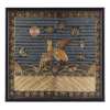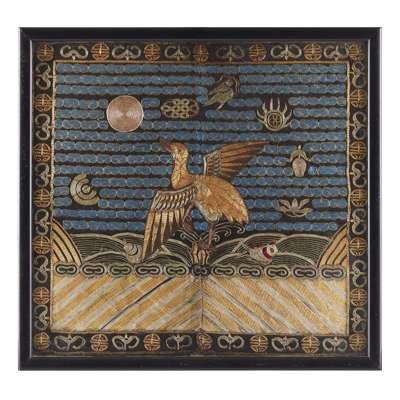 worked in knotted stitches and couched gilt threads to depict a yellow bird (possibly an oriole standing for civil officials of the eighth rank) facing the sun as it stands on a rock emerging from waves, surrounded by the bajixiang (the Eight Buddhist Emblems) amongst ruyi-shaped clouds, mounted within a glazed wood frame