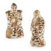 realistically modelled as an elderly couple dressed in elaborate robes painted and gilt allover with flowers and stylised lingzhi heads, each of the two figures holding a broom (2)