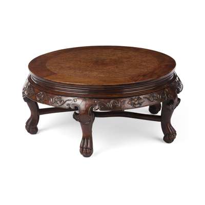 the table with a circular top above a frieze carved with bats and lotus flowers, on scroll legs with claw and ball feet, the stools of open barrel form (5)