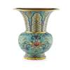 the well-rounded body rising to a widely flaring neck from a spreading foot with a gilt rim, decorated in various colours on a turquoise ground with scrolling lotus to the body and the interior of the mouth, the neck decorated with three upright leaves and lotus flowers between the tips