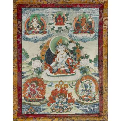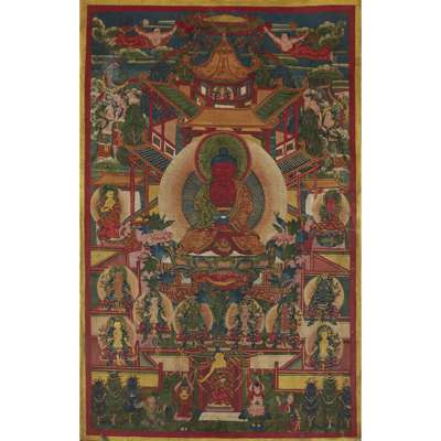 THANGKA DEPICTING THE BUDDHA SHAKYAMUNI WITH TWO DISCIPLES