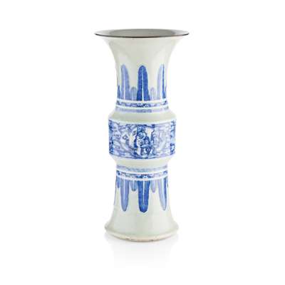 CELADON GLAZED BLUE AND WHITE DECORATED BEAKER VASE, GU
