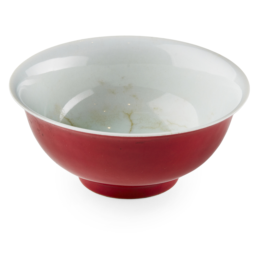well potted with deep rounded sides rising from a short straight foot, applied around the exterior with a deep red glaze, the interior and the base left white, the latter inscribed in underglaze blue with a six-character Qianlong seal mark