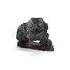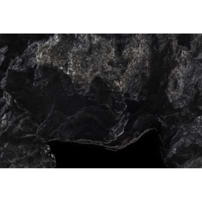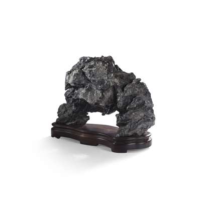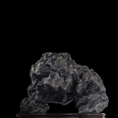 of light grey colour, the curved body creating a suspended arch resting on two points, the highly textured wrinkled body detailed with lighter inclusions and veins that diverge throughout, on a fitted wood stand