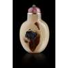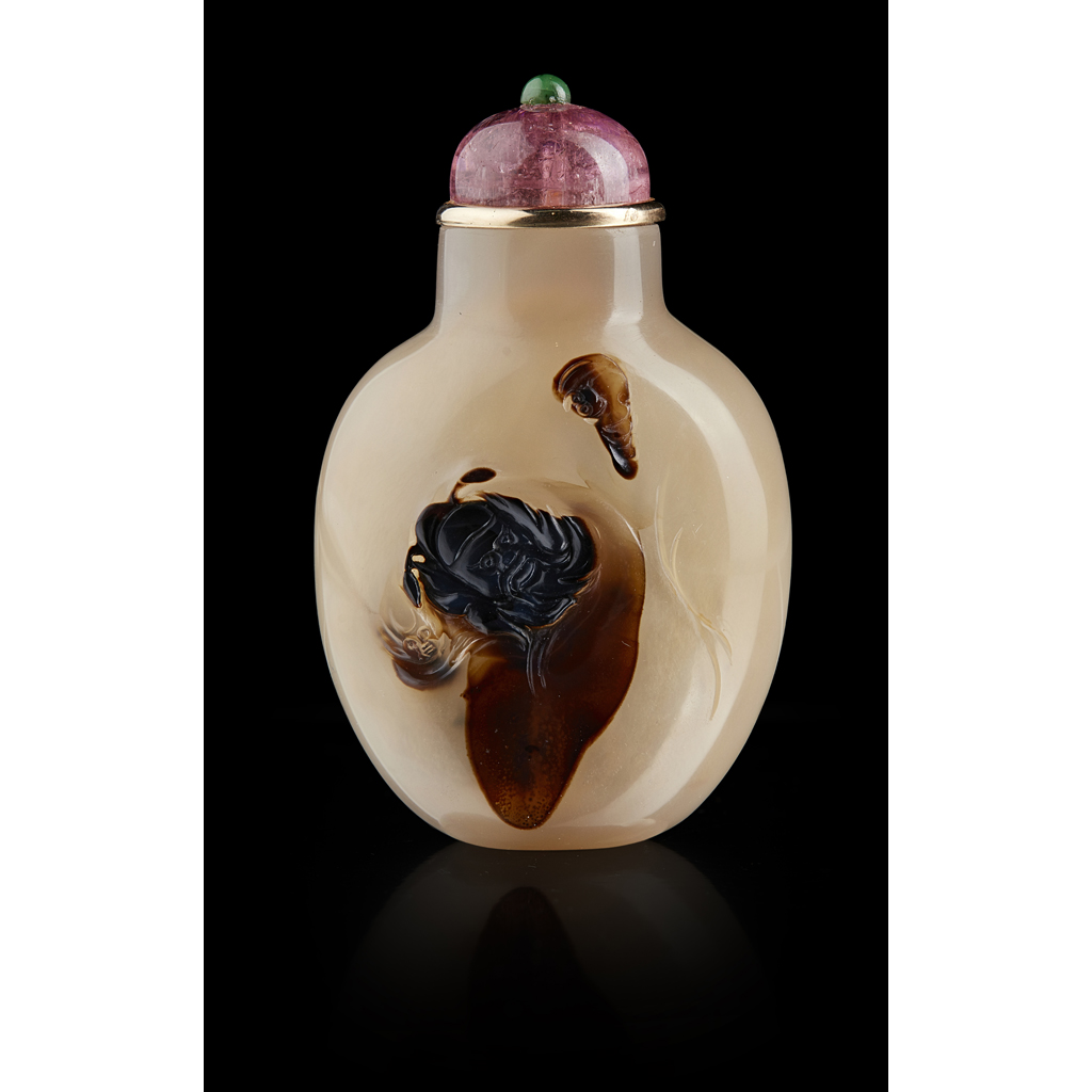 cleverly carved utilising the darker brown markings with the figure of Zhong Kui below a bat, tourmaline stopper