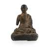 seated in dhyanasana on a rectangular cushion, his right hand raised in vitarkamudra, his left hand holding a scroll, his robes folding and gently cascading in numerous pleats, with engaged expression and steady gaze