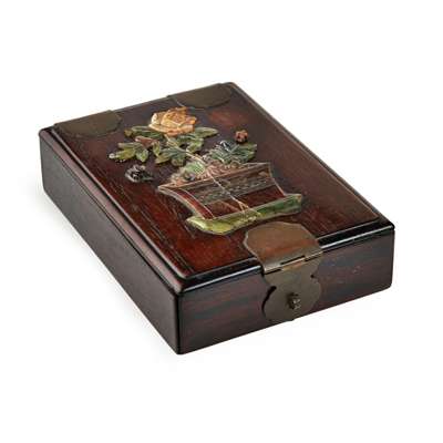 the cover finely overlaid with coloured hardstones depicting a peony flower issuing from a jardinière, the hinged lid opening to reveal several compartments