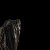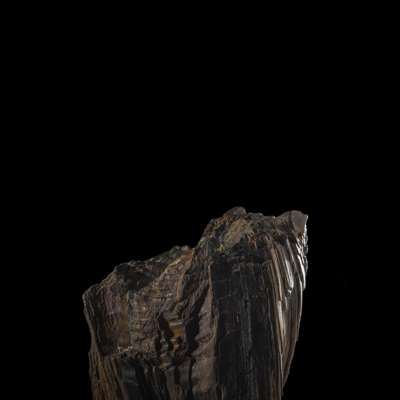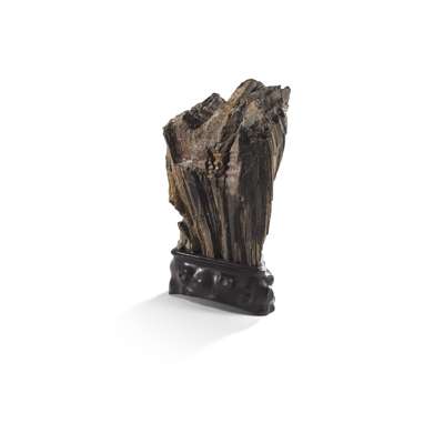 vertically oriented, the body expanding outwards from the base and arching over the rippled surface beneath, the striped stone of caramel, grey and russet tones, with a fitted wood stand