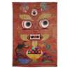 depicting the protector's face with terrifying expression, emerging above a tray of vivid gems, with three bulging eyes, bushy eyebrows, fangs bared, and with flaming moustaches and short beard, a fire breathing scorpion and a snake on each side of the rocky landscape below, the scorpion, messenger of Padmasambhava, acting as protection against harmful spirits and obstacle makers, the snake, a guardian of treasures