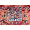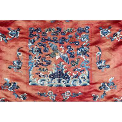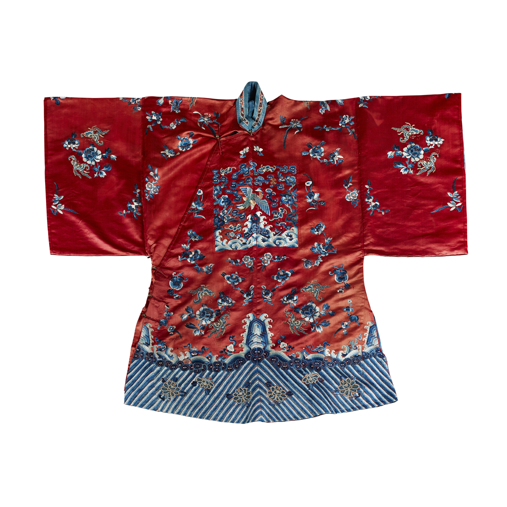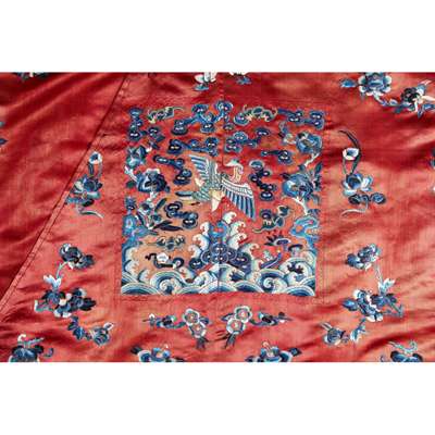 embroidered in blue and white silks with rank badges of a Mandarin duck for a seventh rank civil official, the background of the costume embroidered with floral sprays and butterflies worked in satin stitch and Peking knots, the hem with a wide lishui border decorated with peony flower heads and supporting Precious Objects, the lining of mid blue plain silk