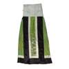 woven with roundels and flower sprays, the front and back panels embroidered with a peacock and other birds amongst prunus blossoms and above a reclining spotted deer, each panel edged with a cream silk ribbon woven with geometric and floral pattern, the pleated side panels concealing embroidered flower heads within each pleat, with a black silk trim and blue silk damask lining with fret pattern, a wide cotton band to the upper border with loop fastenings