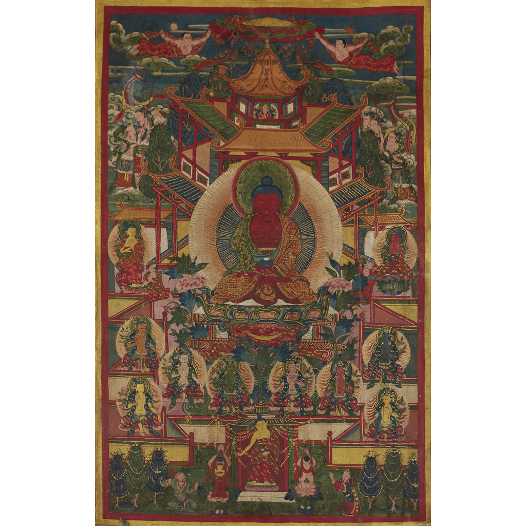 THANGKA DEPICTING THE BUDDHA SHAKYAMUNI WITH TWO DISCIPLES