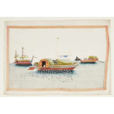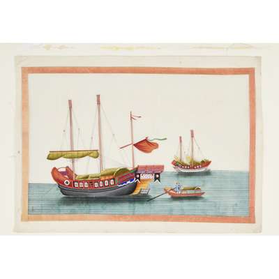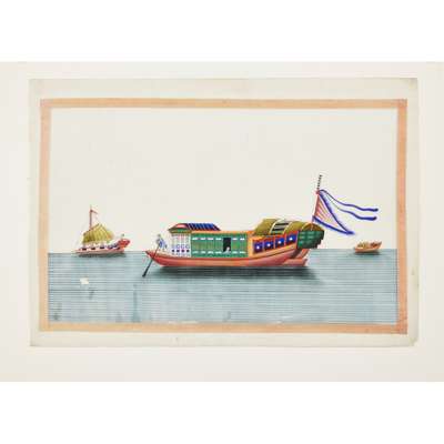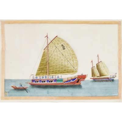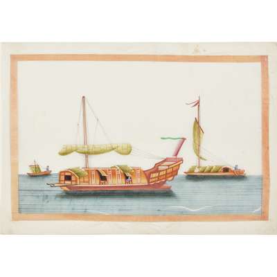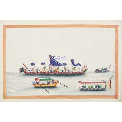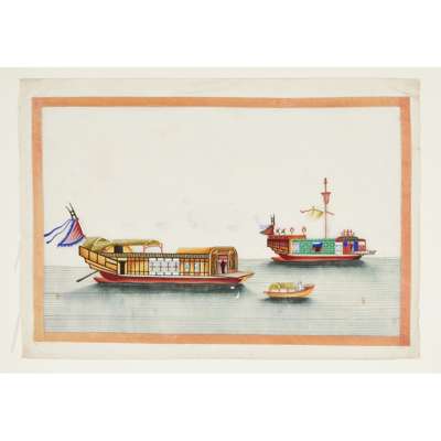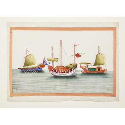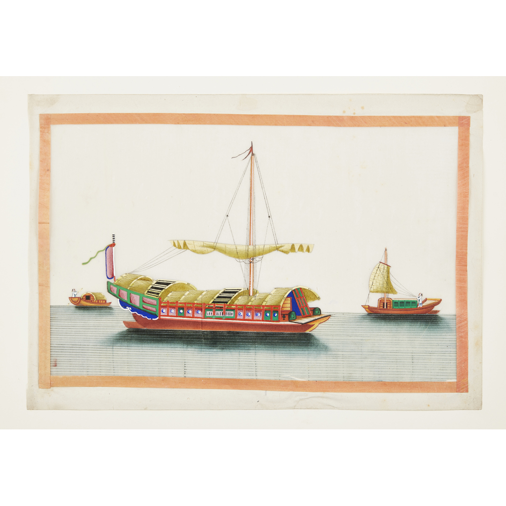 gouache on paper, of exceptional quality with meticulously painted details of the vessels and figures, one boat marked 'Made by Peng Shun' (9)