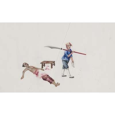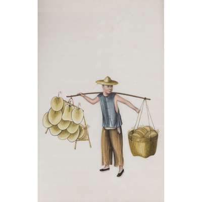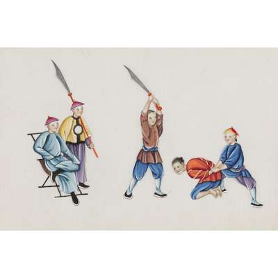 gouache and ink on pith paper, two albums depicting scenes of punishment and torture, one containing ten, the other eleven leaves, the third album depicting mainly street vendors, containing five leaves; together with NINE LOOSE-LEAF PITH PAPER PAINTINGS OF CHINESE LIFE (qty)