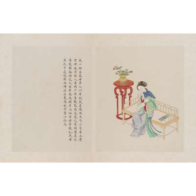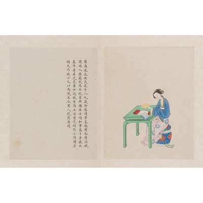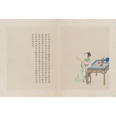 ink and colour on paper with gilt highlights, comprising twelve leaves depicting the famous historical female figures Xue Tao, Bu Feiyan, Guan Panpan, Xie Shanshan, Zhu Xiaoji, Qin Ruolan, Yao Yuehua, Xue Yunhui, Princess Pinyang, Zhaoyun, Wang Qinghui and Zhou Ehuang, each leaf accompanied by an additional one inscribed with a short biography of the depicted figure