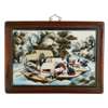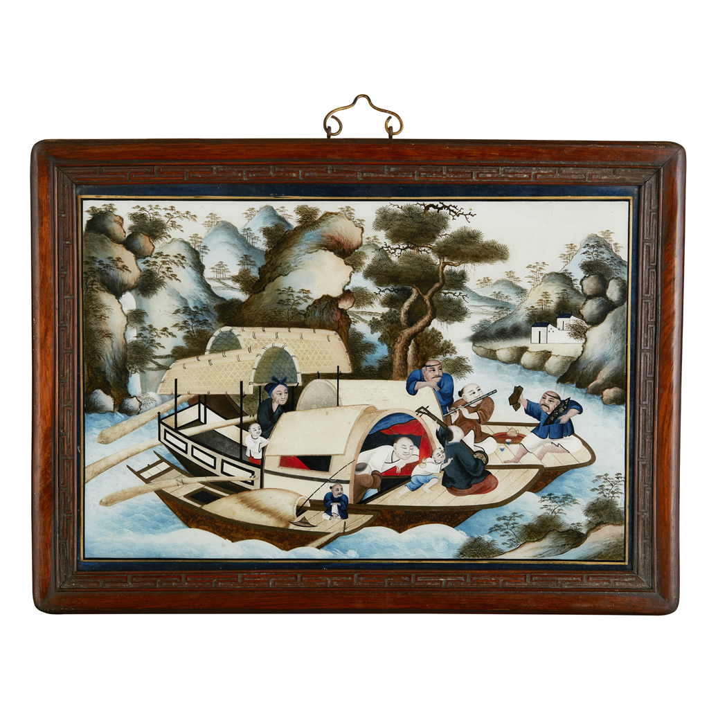 painted with figures travelling on ferries along a river, some taking a rest whilst others play music and dance, with wood frame