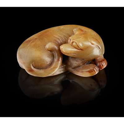 GREEN AND RUSSET JADE CARVING OF A DOG