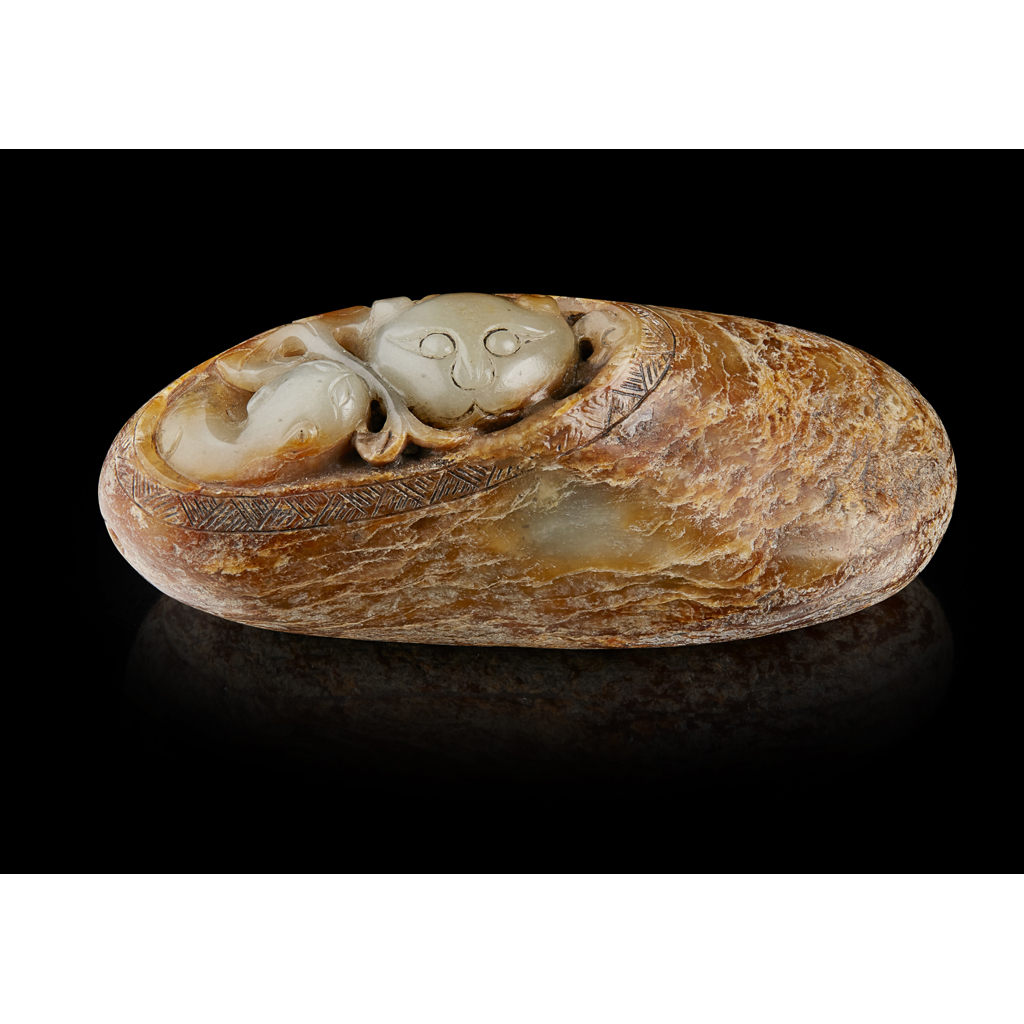 CELADON AND BROWN JADE CARVING OF A MYTHICAL BEAST
