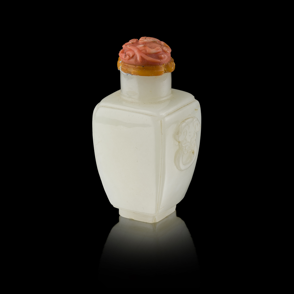 of square section carved with a pair of mythical beast masks and affixed ring handles, the coral stopper carved with a coiled chilong dragon, the stone of a greyish white tone