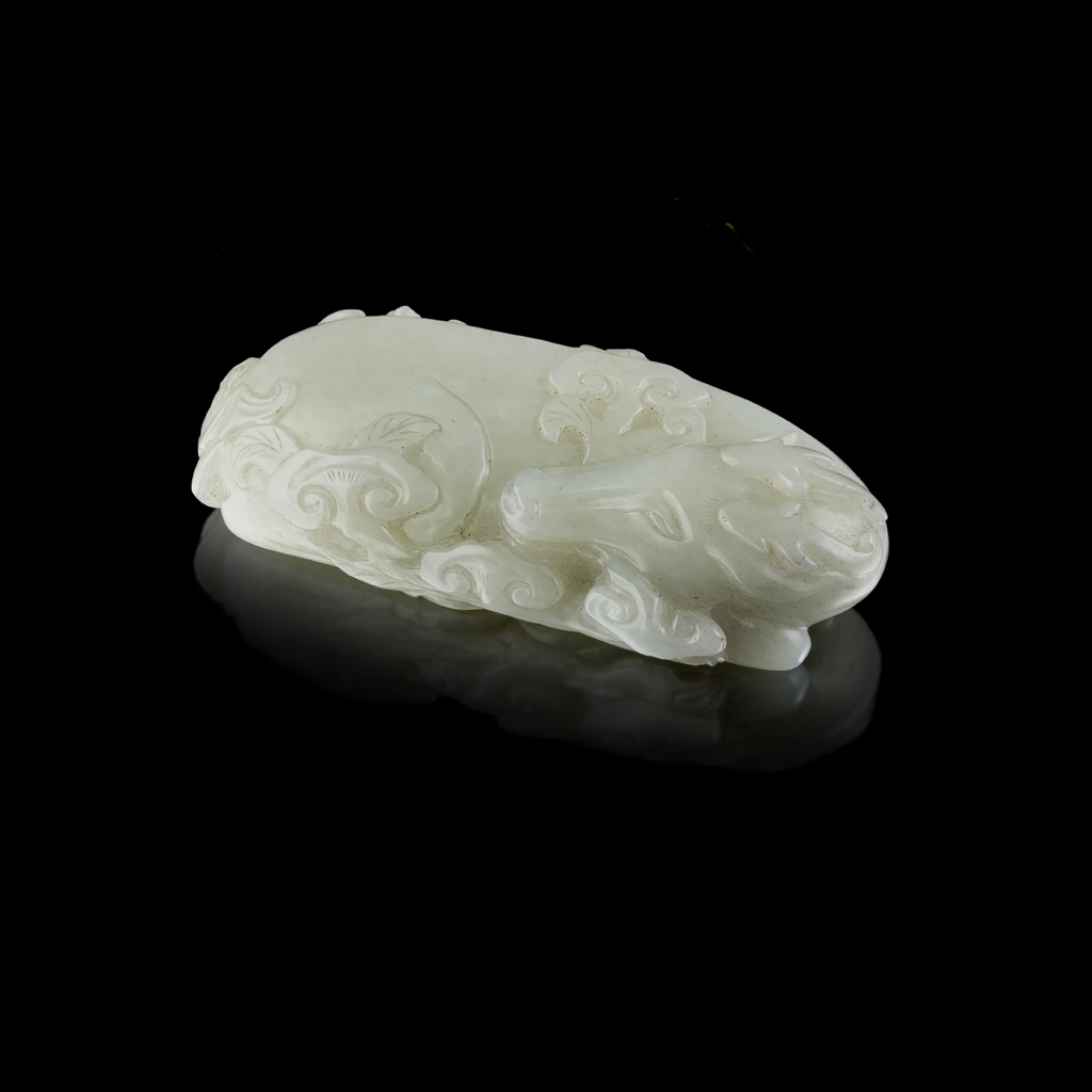 the deer shown in a recumbent position with head turned backward, holding a fruiting lingzhi branch in its mouth, surrounded by two bats