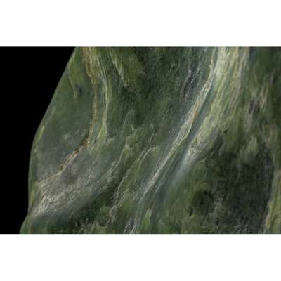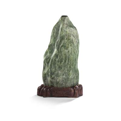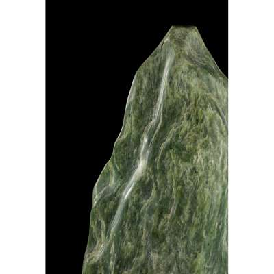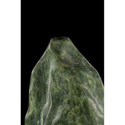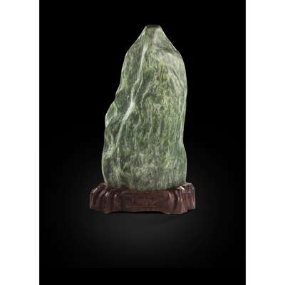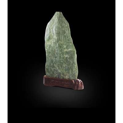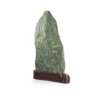 of green tones with powdery inclusions, the tall large rock narrowing to a peak resembling the flickering of a flame, with a sense of movement created by the mottling of the colours and the gentle lustre to the surface, with carved and fitted wood stand