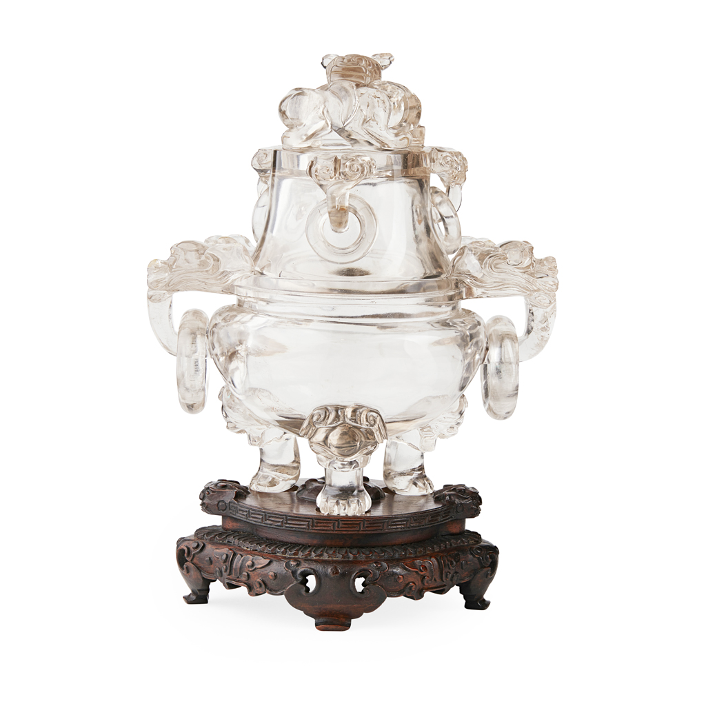 UNUSUAL ROCK CRYSTAL TRIPOD CENSER AND COVER