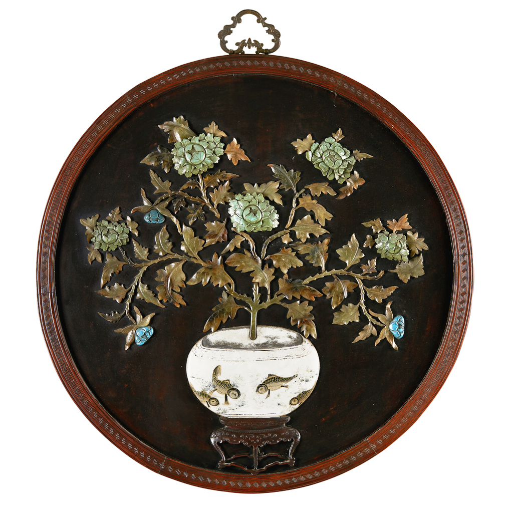 set in a carved wooden frame with a continuous key fret border, depicting a jardinière with painted fish with gilt scales standing upon a carved wooden stand, the tall blossoming chrysanthemum tree with green and turquoise hardstones forming the flowers and buds, the back lacquered with gilt flower decoration