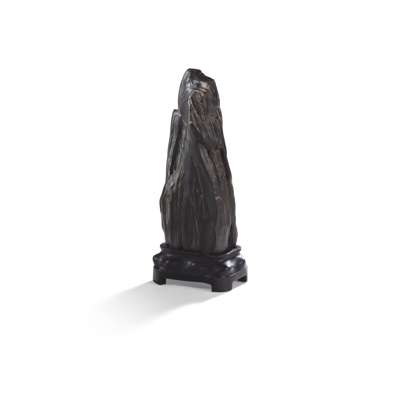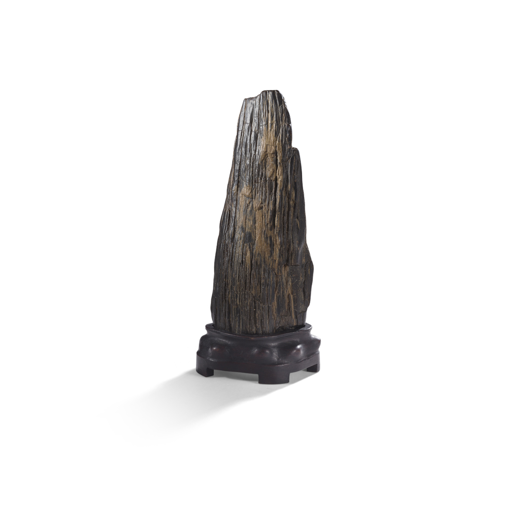 of monolithic form, the fossilised wood of dark brown tone with russet tones accentuating the striation lines running vertically to the surface, with fitted wooden base