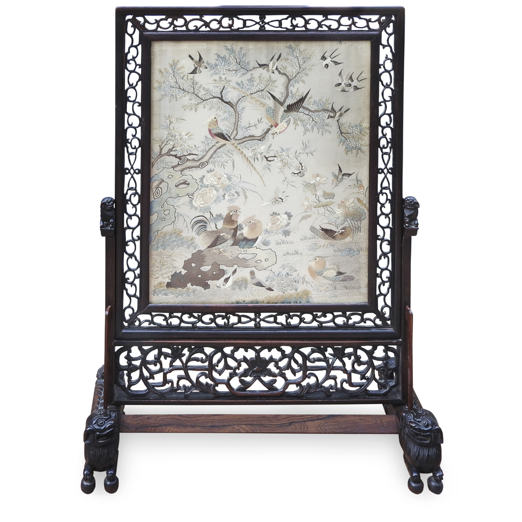 EMBROIDERED SILK AND HARDWOOD 'HUNDRED BIRDS' SCREEN