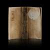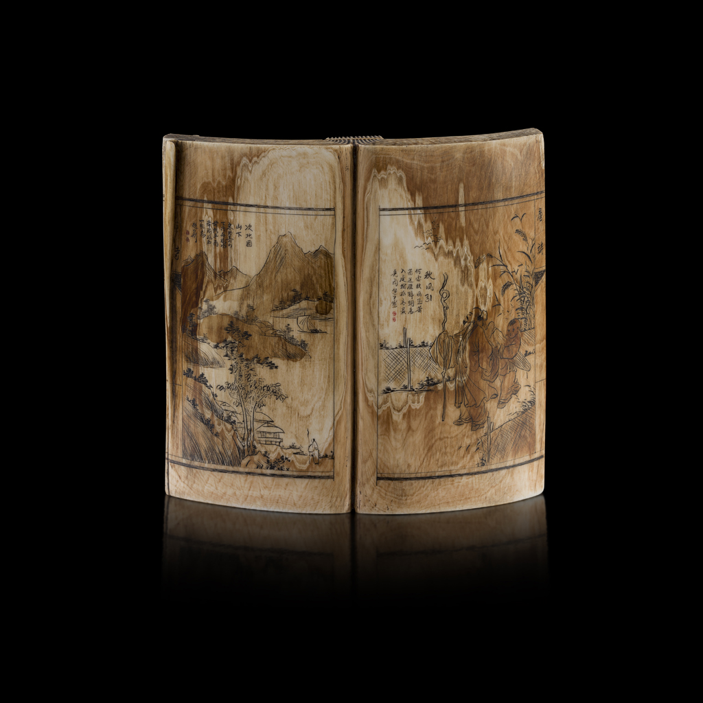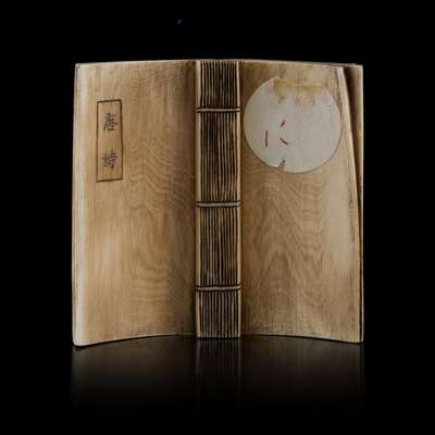 naturalistically carved as the Book of Poems from the Tang Dynasty, open to reveal two pages each incised with a scene of figures in a landscape or in a garden, one page inscribed with the poem Autumn Wind by Liu Yuxi, the other with A Mooring Under North Fort Hill by Wang Wan