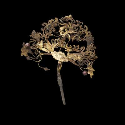 fan shaped with finely gilt filigree of phoenixes and dragons clasping flaming pearls amongst clouds, with hardstone embellishments (2)
