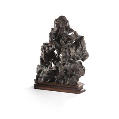 vertically oriented and blackened in colour with hints of the dried wood beneath, the body contorted with gnarled and twisted roots creating complex apertures, with fitted stand