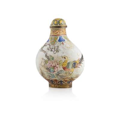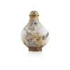 each of quatrefoil foil depicting a pair of figures in a landscape, with a poetic phrase inscribed, 9.5cm long; together with a CANTON ENAMEL SNUFF BOTTLE, Qianlong mark to base, 6.5cm high (3)