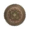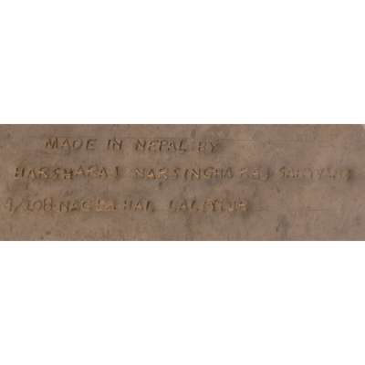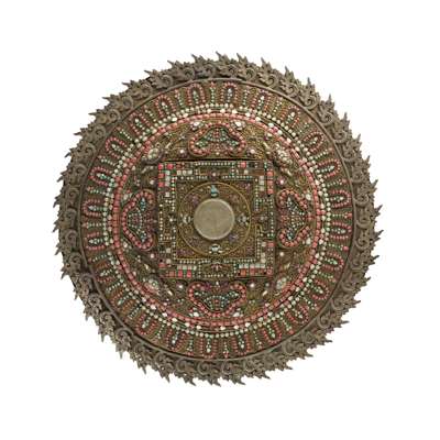 formed in concentric circles with a square central panel mounted with a jade plaque, the heavily inlaid body with coral, turquoise and hardstones forming ruyi heads and flowers, the outside band of stylised flames, the back mounted with copper inscribed with "made in Nepal by Harshraj Narsingha Raj Sakyvans, 4/208 Nag Hal Lalitur"