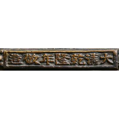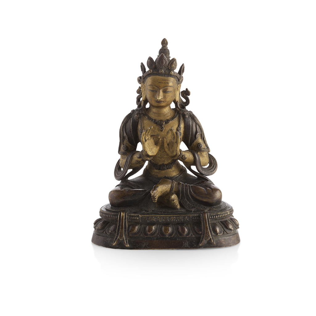 the God of Wind shown seated on a lotus base, the right hand held in vitarkamudra, the left in abhayamudra, the front of the lotus base cast with a seven-character Qianlong reign mark and incised with the Chinese name of the deity 'Feng Tian', the reverse of the base inscribed with 'De Xing Gen Ben'
