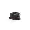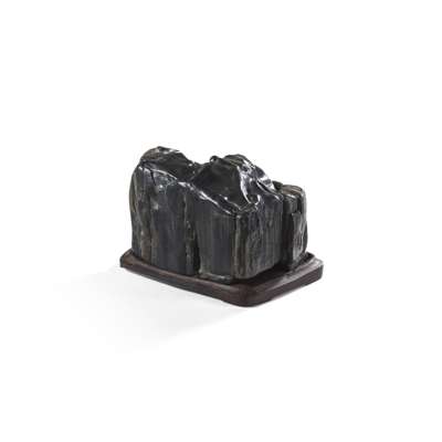 of compact form, with short precipitous sides and undulating top, the dark grey glossy body striped with light veins running vertically and scattering the light, with fitted wood base