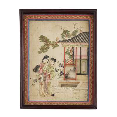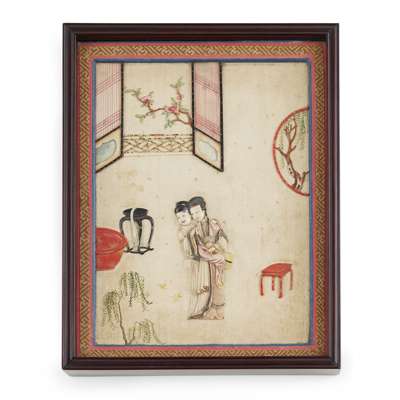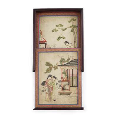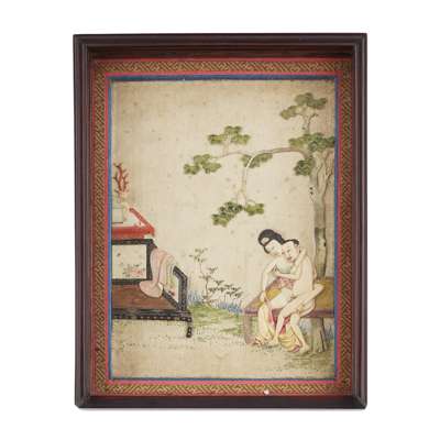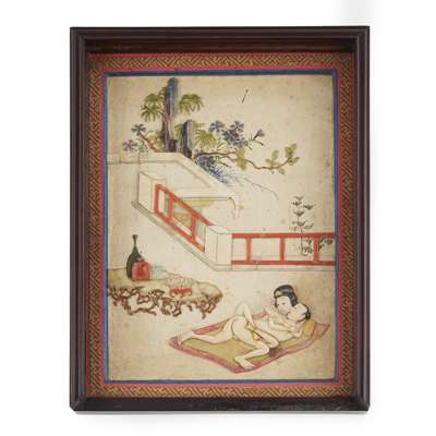 Hailed as 'The Chinese lover's bible', the story has inspired Chinese public imagination for centuries, and has been adapted across a broad range of artistic media: from paintings, woodblock prints, porcelain to ivory carvings. Soapstone inlaid panels from the Qianlong period such as the present lot however are extremely rare, and have almost never appeared on the market. China Guardian sold a similar set of four panels, which however does not include erotic scenes, on 15.11.2011. Another set of ten panels from an unnamed private Chinese collector, similarly arranged into 'romantic and erotic' pairs, was exhibited in 2007 in Beijing.