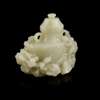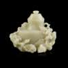 the flattened vase flanked by a pair of dragons clambering up the sides in pursuit of a flaming pearl, above foaming waves crashing against rocks, the greenish stone with some snowflake inclusions