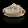 the boy leaning against the oversized drum and striking it with a drumstick, the group supported on a large lotus leaf, the jade with russet and brown inclusions