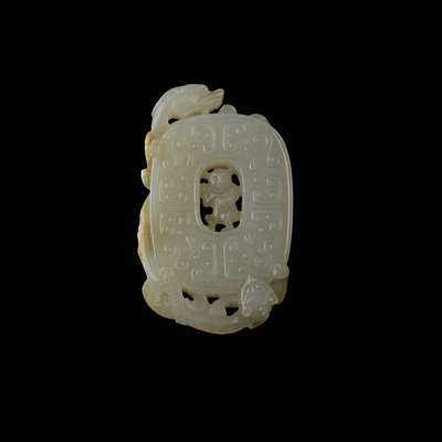 carved and pierced with a boy in the hollow of a bi-disc relief highlighted by archaistic scrolls, two dragons curled around the rim of the disc, the well polished stone of a pale greyish celadon tone with areas of minor russet inclusions