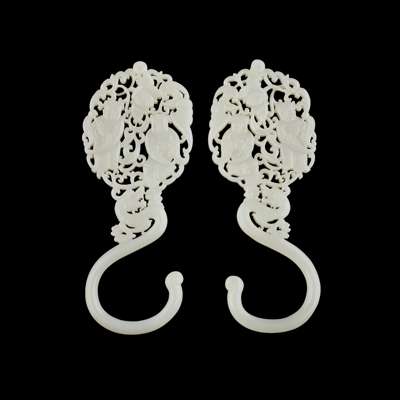 each hook issuing from a dragon head surmounted by a finely carved and pierced plaque depicting two boys holding a spray of lotus (2)